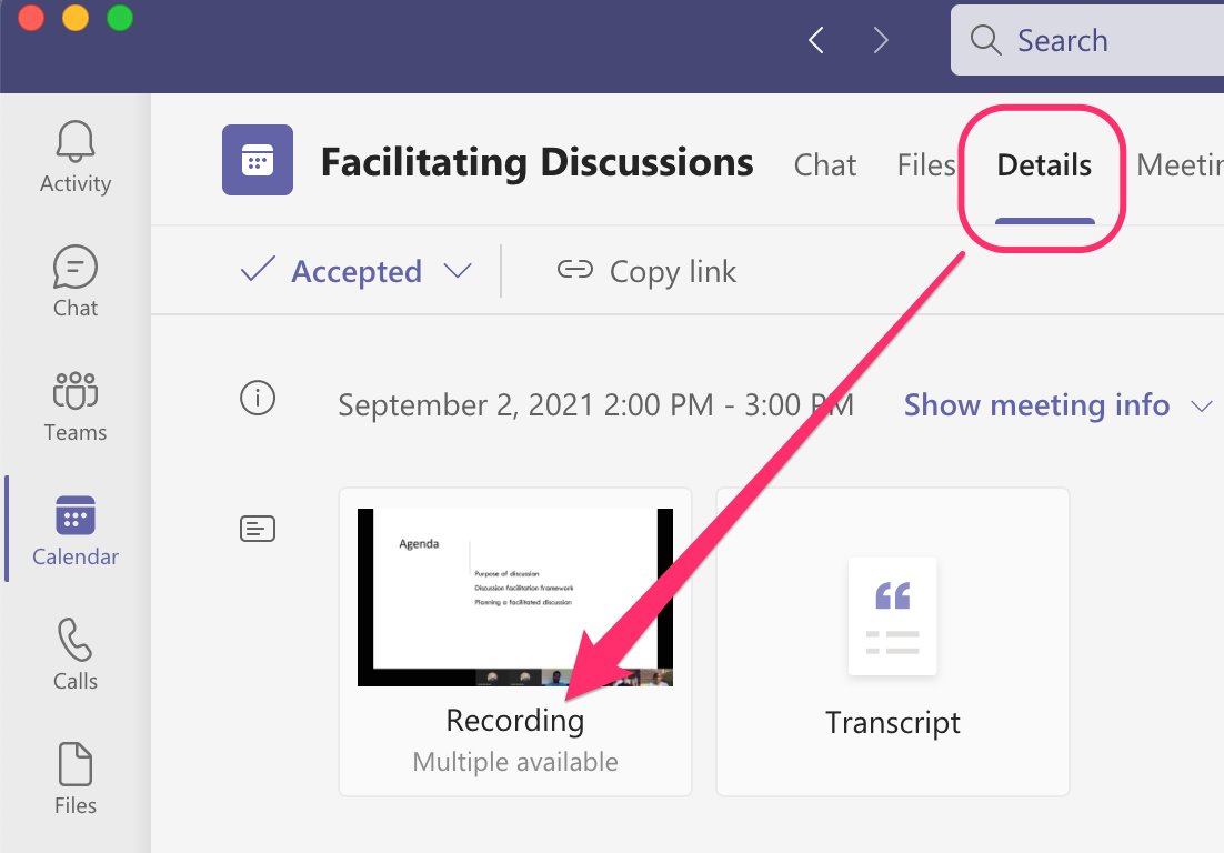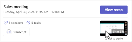 - Meeting chat: Go to Chat, open the meeting thread, and click the recording thumbnail.